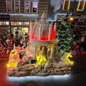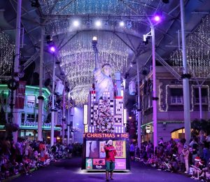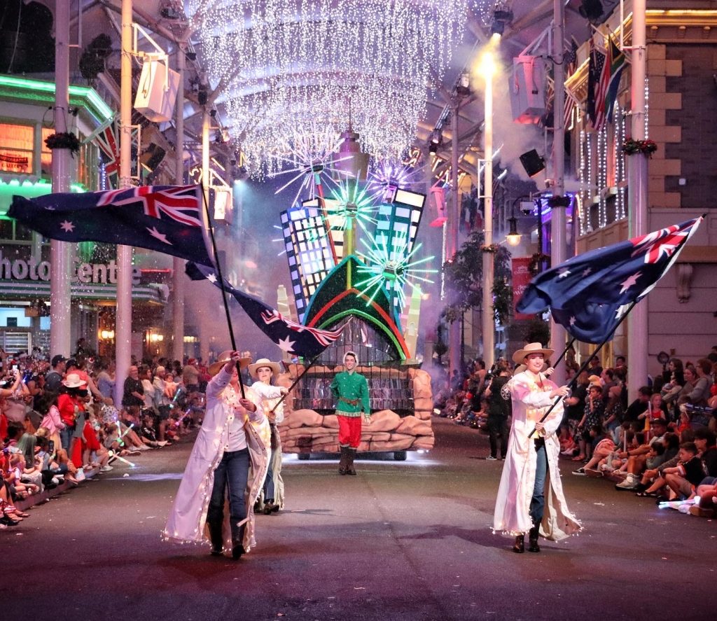With the theme of “Joy to the World”, the nightly parades, led by Santa Claus on his sleigh, involved motorised floats with landmarks from London, Paris, New York, Rome and Sydney, as well as beloved characters such as Gizmo from Gremlins, Bugs Bunny and Tweety, flanked by dancers and characters in costume.