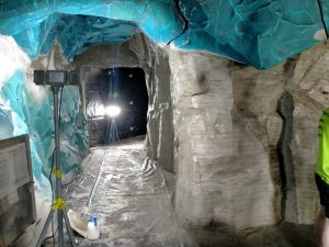 They used GRG for the entire hanging ceiling in rock – over 200-square-metres. The ceilings went in first, then technicians installed the screens in the roof for the audio-visual part of the experience, and finally, the Sculpt Studios team built the rock walls up around it.