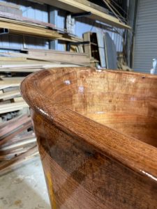 “It’s constructed like a strip plank boat which is what makes it unique in relation to other wooden baths,” says the skilled boat builder. “Most wooden baths are vertical stave constructed or solid sawn stacked. What we’ve done is construct a lightweight solid core out of paulownia staves. The shape was designed on CAD by Matt off a concept drawing I’d done.