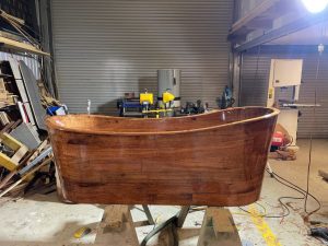 It was a mad rush to get it completed for their final reveal filming on the house, which took place 17 June 2024. Now, the team from Tasmanian Shipwrights & Co have taken the bath back to their workshop for the final topcoat of Epifanes.