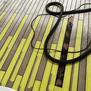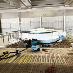 The three-month project involves replacing sections of teak decking over the massive superyacht’s exterior, ensuring the deck levels are fared to perfection to ensure run-off to existing drainage – which in some places is 50-millimetres.
