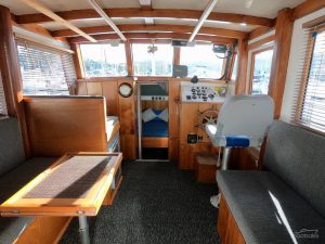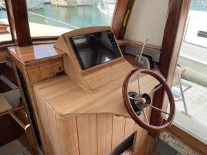 Other features include 240 watts of slimline solar panels within the wheelhouse roof, coupled with a Morningstar MPPT controller charging 480ah of house batteries which are isolated with Blue Sea Systems remote battery switches. And of course, the wine cooler under the bar.